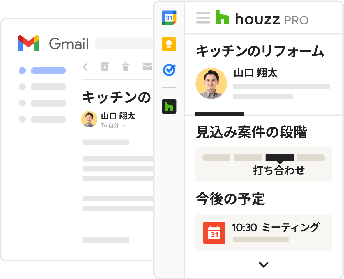 Gmail のメッセージを見込み案件としてワンクリックで Houzz Pro に追加できます。Houzz Pro で作成した返信テンプレートを Gmail で使用することも可能です。