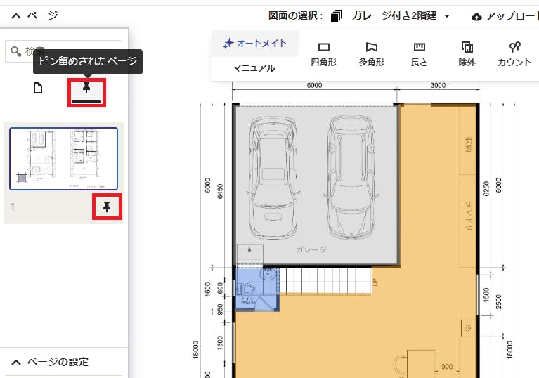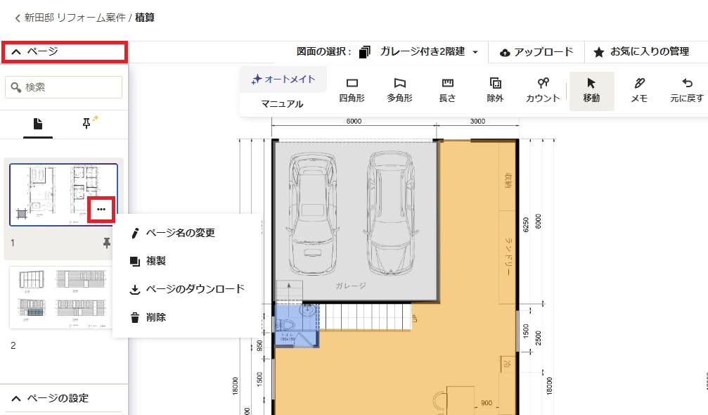 積算ツールを使用する際、画面の左側にあるページ設定を変更すると、作業がしやすくなります。各ページを編集したり、図面全体を編集したりできます。
