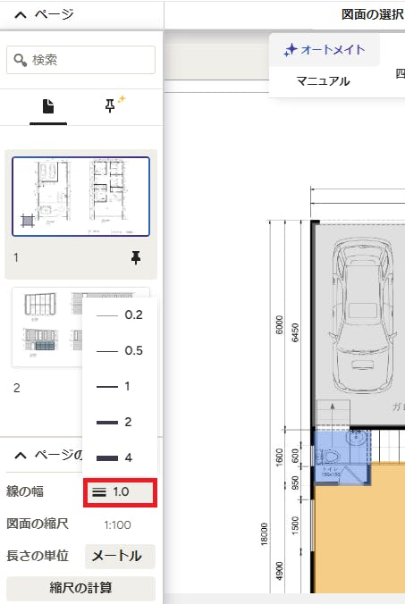 ページ設定画面の下の方では、図面上に直線を引いたときの線の幅(線の太さ)を調整することができます。数字が表示されている部分をクリックすると、変更できる候補の太さ(0.2、0.5、1、2、4)が表示されるので、設定したい太さを選択します。