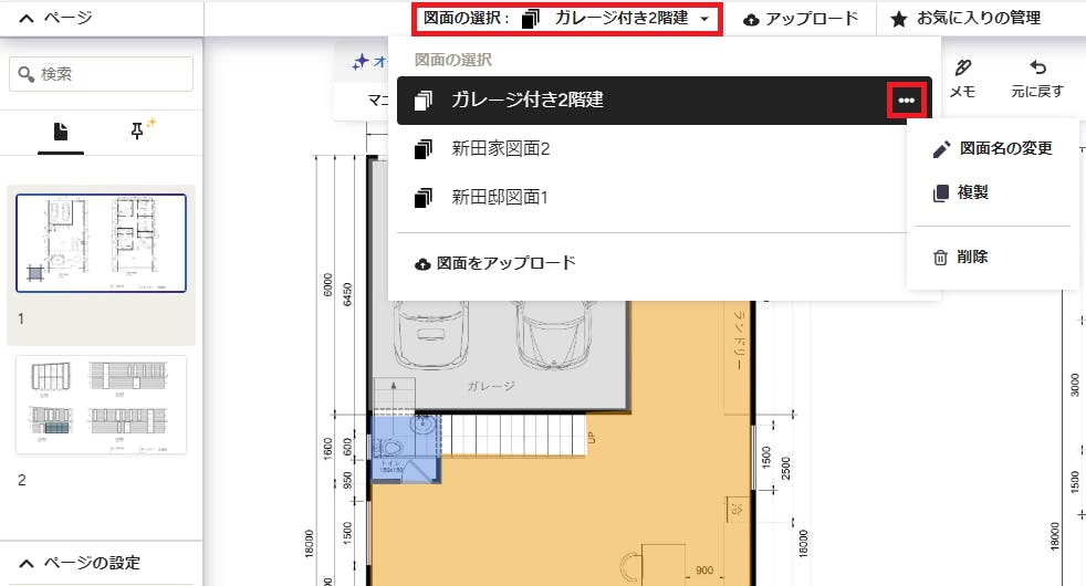 各ページではなく、図面全体の名前を変更したり、複製したり、削除したりしたい場合は、積算ツールのキャンバス(作業エリア)の上部にある図面の名前をクリックします。そして、変更したい図面にカーソルを合わせると3点ドットが右端に表示されるので、それをクリックすると、名前の変更、複製、削除のメニューを選択できます。